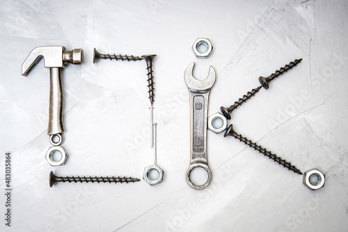 Text OK shaped from hand tools and fasteners on gray
