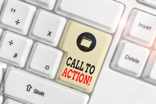 Text sign showing Call To Action. Business photo showcasing exhortation do something in order achieve aim with problem White pc keyboard with empty note paper above white background key copy space
