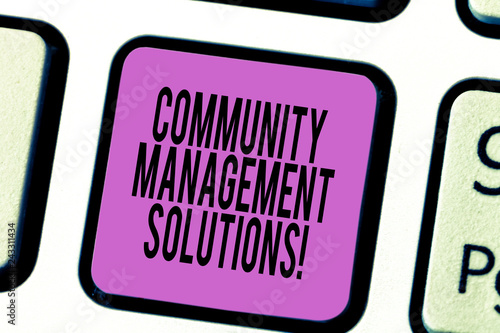 Text sign showing Community Management Solutions. Conceptual photo Manage and engage the community of your brand Keyboard key Intention to create computer message pressing keypad idea