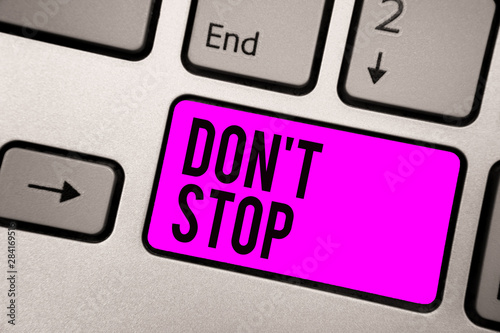 Text sign showing Don t not Stop. Conceptual photo Continue what had been doing without rendering a delay Keyboard purple key Intention create computer computing reflection document
