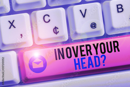 Text sign showing In Over Your Head Question. Business photo text To be involved in a difficult situation problem White pc keyboard with empty note paper above white background key copy space