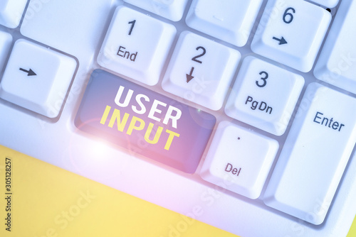Text sign showing User Input. Business photo text Any information or data that is sent to a computer for processing White pc keyboard with empty note paper above white background key copy space