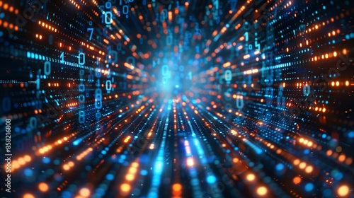 The abstract digital background showcases the operation of binary code and AI algorithms, reflecting the integration of artificial intelligence, data processing, and technology.
