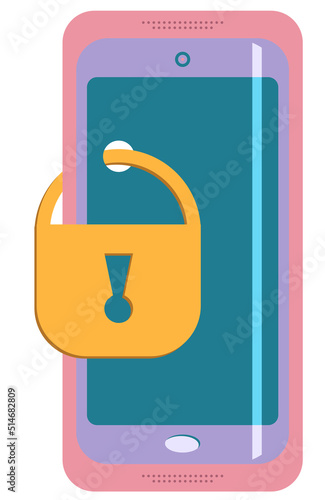 The bitmap image is a bright close-up smartphone with a large lock isolated. Concept - protection of personal data on the Internet