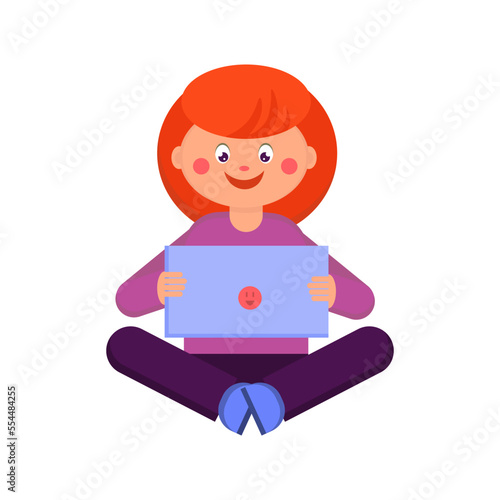 The child is sitting with a tablet in his hands and smiling. Online education. Vector drawing