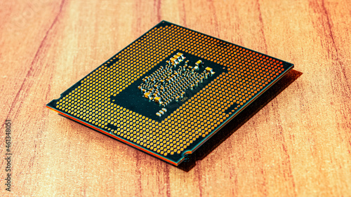 the computer chip lies on a wooden table. Computer elements. old processor. Computer techologies .