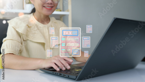 The concept of calculating taxes to be paid. Woman using computer to calculate tax through website and having headache paying taxes.