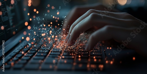 The concept of digital technology and software development is represented by a coder working on a laptop with a circuit board and javascript displayed on a virtual screen