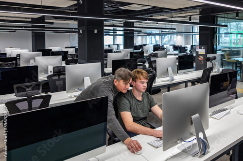 The concept of education, the teacher teaches a young man at the computer, teaching students in the workshop, using a computer in high school, at the university, studying network communications and
