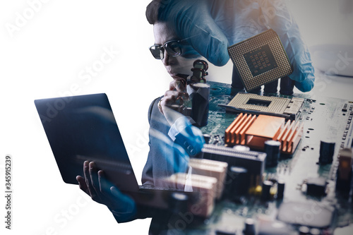 The double exposure image of the businessman standing overlay with the CPU installing image. the concept of AI, electronics, intelligence, technology and internet of things.