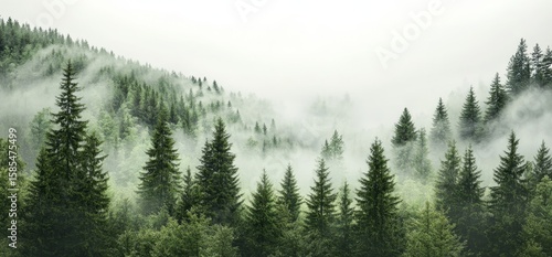 The dramatic fir-tree forest set against a gray sky in the fog creates a creative background