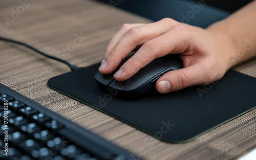 The image depicts a hand using a computer mouse, keyboard, and a textured surface, highlighting the interaction between the hand and computer peripherals in a workspace setting.
