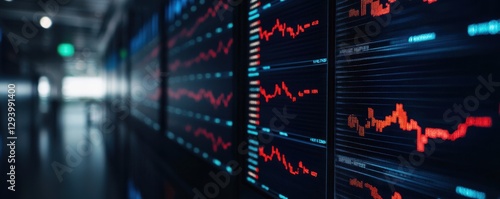 The image features digital screens displaying fluctuating graphs and data in a modern, tech-focused environment.