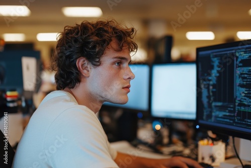 The image showcases a tech enthusiast engrossed in coding, emphasizing the passion and focus required to navigate the complexities of modern programming tasks in digital workspaces.
