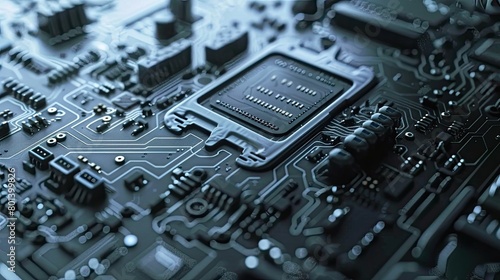 The image shows a close-up of a computer circuit board with a central processing unit (CPU) chip
