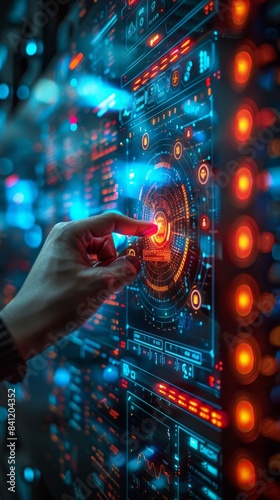 The image shows a futuristic interface where a hand interacts with advanced touchscreen technology