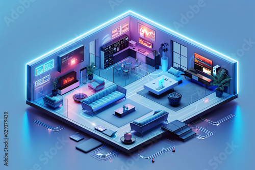 The interior of a futuristic smart home, depicted in an isometric style, highlights AI-driven management systems for various home components. The clean, minimal color scheme and generous copy space