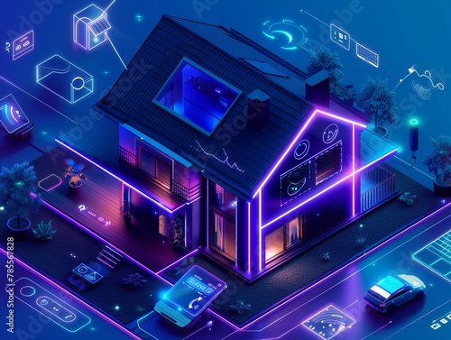 The isometric concept illustrates a smart home where a private house is represented by a code consisting of digits, emphasizing the cyber safety of the Internet of Things (IoT) for country houses.