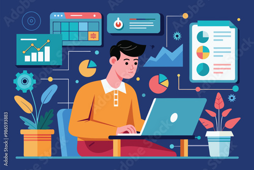 The man is engaged in data analysis on his laptop, surrounded by various charts and graphs displaying insights, A man handles data, simple picture.
