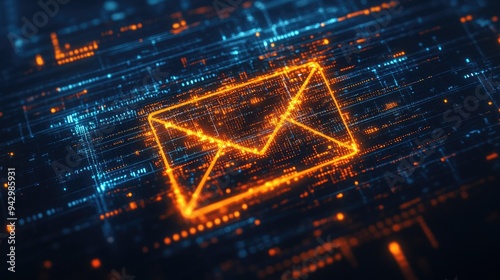 The orange email icon emits a strong glow as data lines cascade around it, set against a sophisticated dark blue digital background.