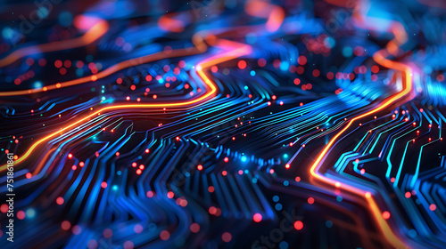 The photo captures a close-up view of illuminated, colorful circuitry or data streams, giving off a futuristic and technological vibe