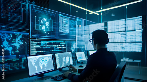 The power of digital technology with a focus on a software engineer utilizing a computer with lines of code, data analysis, and AI algorithms to improve business operations