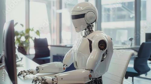 The robot sits at the table, there is a computer next to it