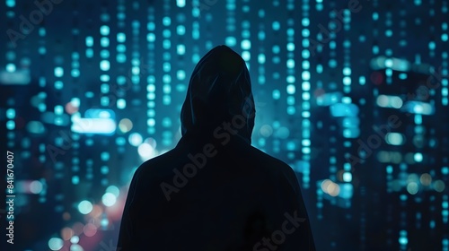 The silhouetted figure stands amid the illuminated cityscape evoking a sense of mystery and intrigue in the urban landscape