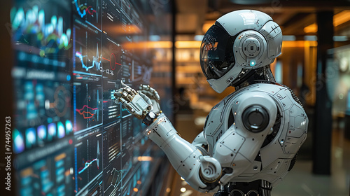 The simulation robot pointed at the large screen and introduced complex data ,generative ai