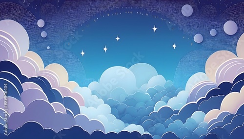 The sky background is filled with pastel fluffy clouds in a paper layer format.