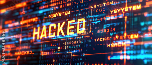 The text "SYSTEM HACKED" was written on a digital screen, against a background of computer code and binary numbers, representing a cyber security concept