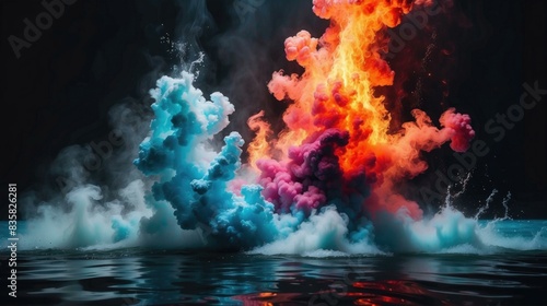 The vibrant colors of the smoke and the water create a mesmerizing scene. AI.