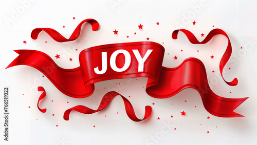 The word "JOY" on a red banner with a textured material.