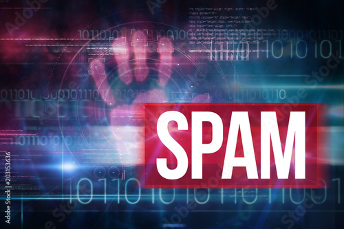 The word spam and pink technology hand print interface design against blue technology design with binary code