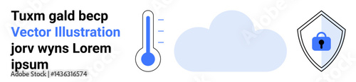 Thermometer, cloud, and shield with lock visualizing data storage, monitoring, and security. Ideal for technology, cybersecurity, cloud computing, data analysis weather apps IoT flat landing page