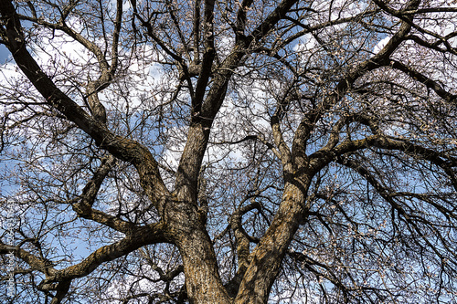 thick apricot tree and its branches, leafless large apricot tree and branches,