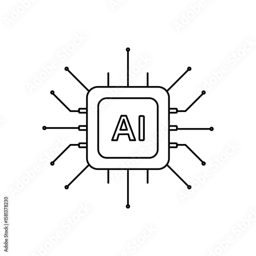 Thin outline AI chip with detailed connections, symbolizing electronics, data, and neural computing.