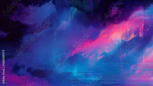 This abstract background iage features a glitch effet that gives it a digital,futuristic look. The imagehas a color scheme of blue purple, and pink with disorted lines and shapes
