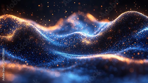 This flowing data visualization, with its glowing particles creating a wave effect, represents big data concepts and digital transformation against a serene blue background.