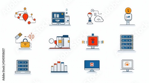 This image depicts a collection of 15 well designed and detailed data center icons including elements such as servers cloud computing networks and data storage