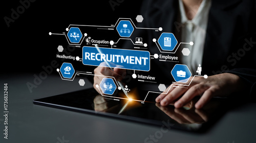 This image showcases a digital recruitment process with a professional interacting with a tablet, highlighting modern hiring techniques and virtual elements. Tessel