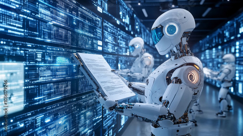 This image shows robots using technology to work with data. They are moving files, extracting information, and using digital tools. It's a 3D illustration that shows how robots can automate tasks.