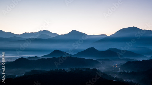This photo was taken on a mountain summit in Taiwan, Asia. It was cold early morning. As the sunrise, one can see the shadows and silhouette of layers of mountains and ghostly clouds.