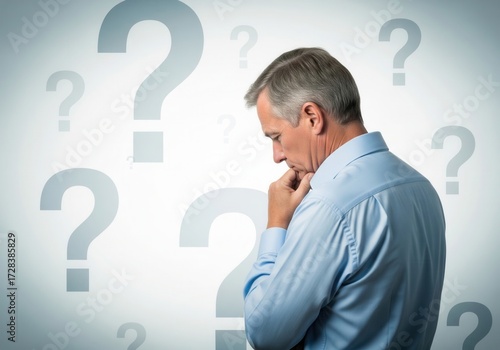 Thoughtful Man Deep in Thought Surrounded by Question Marks