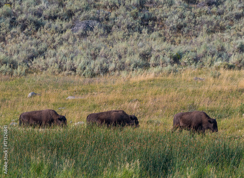 Three Bison Mosey Across Field