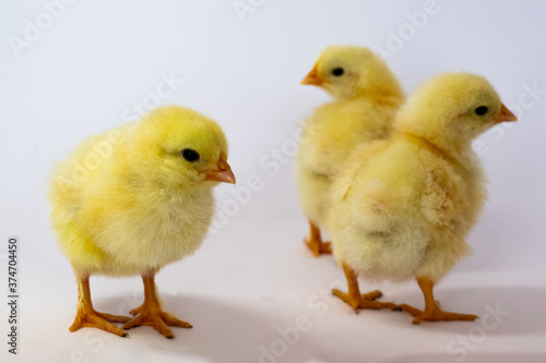 Three chickens walking chaotically on a white background