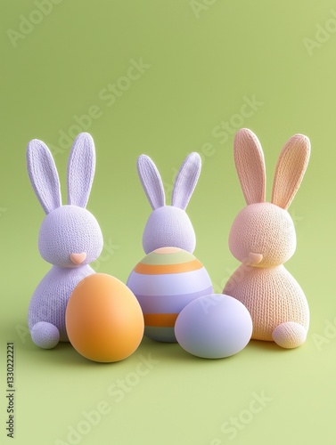 Three cute, textured bunnies with colorful eggs against a pastel green background, creating a cheerful, festive atmosphere.