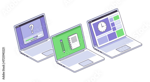 Three laptops displaying different screens including a loading bar with a question mark a document with a pen and a dashboard with a clock and charts