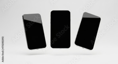 Three Modern Smartphones Standing Vertically on White Background