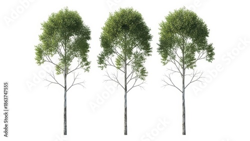 Three Ornamental Trees Isolated on White Background, Green Foliage, Bare Branches